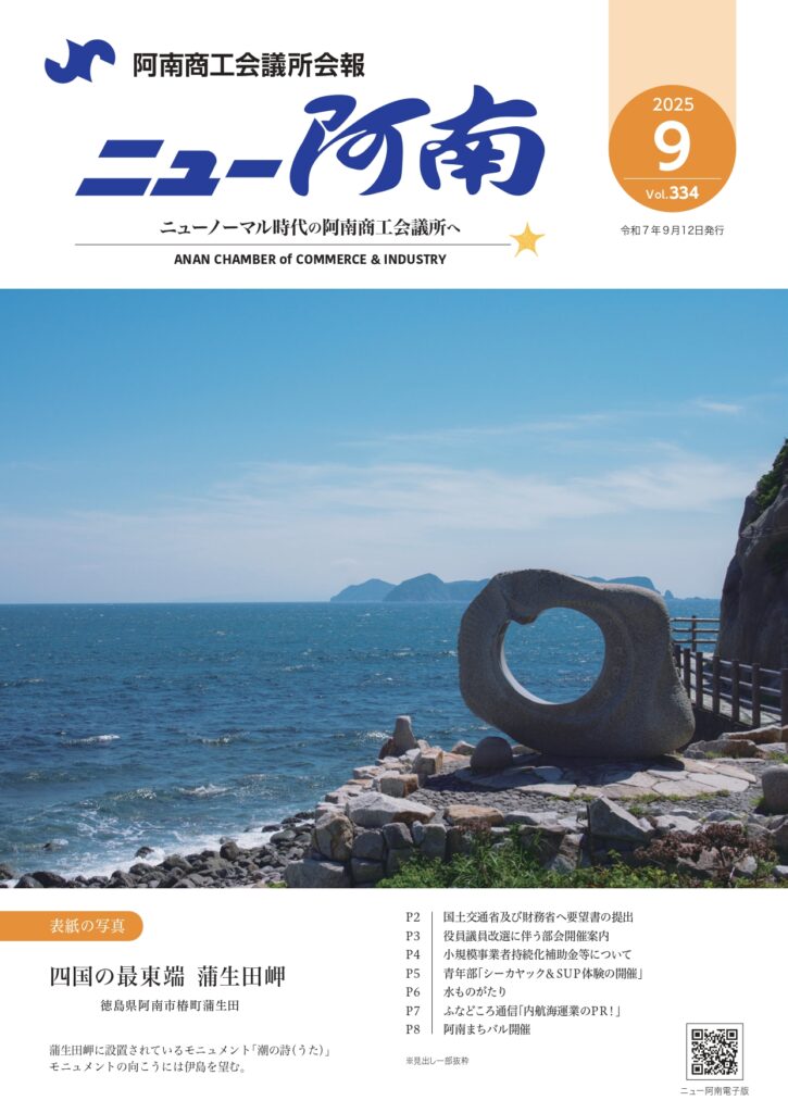 2025年9月17日 / 最終更新日時 : 2025年9月17日 anancci お知らせ 会報「ニュー阿南9月号」発行 阿南商工会議所会報「ニュー阿南9月号(Vol.334)」が発行されました。 電子版はこちら FacebooktwitterHatenaPocket